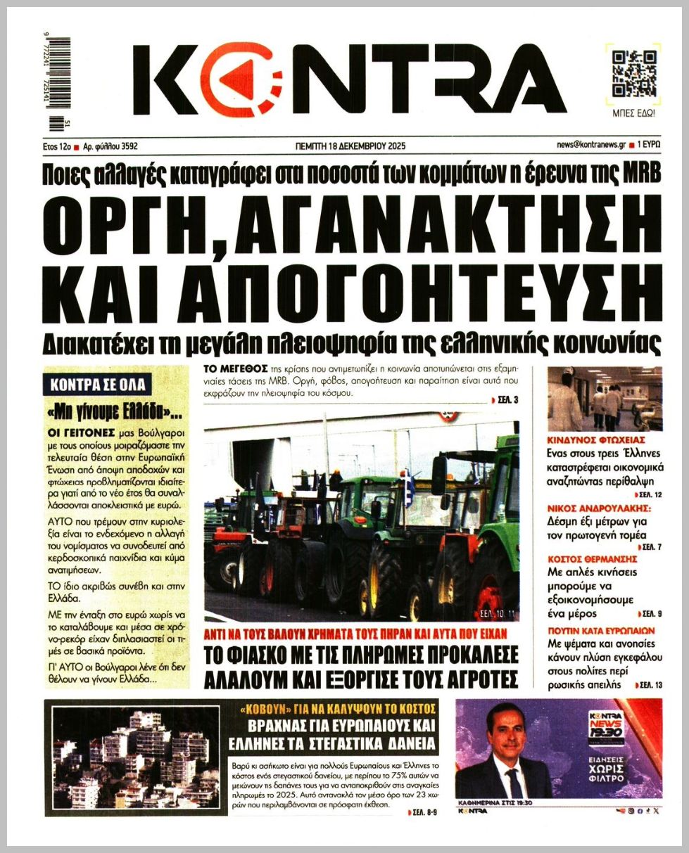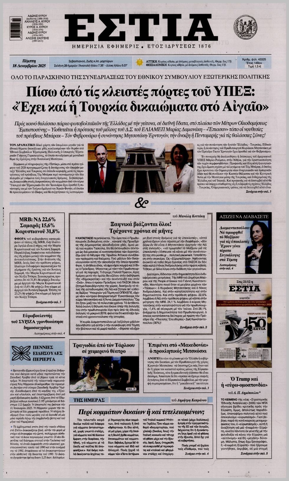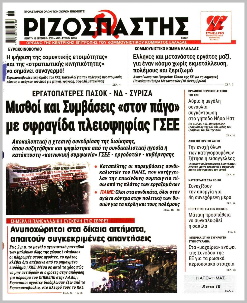 Τα πρωτοσέλιδα του ελληνικού τύπου για Πέμπτη 18 Δεκεμβρίου 2025